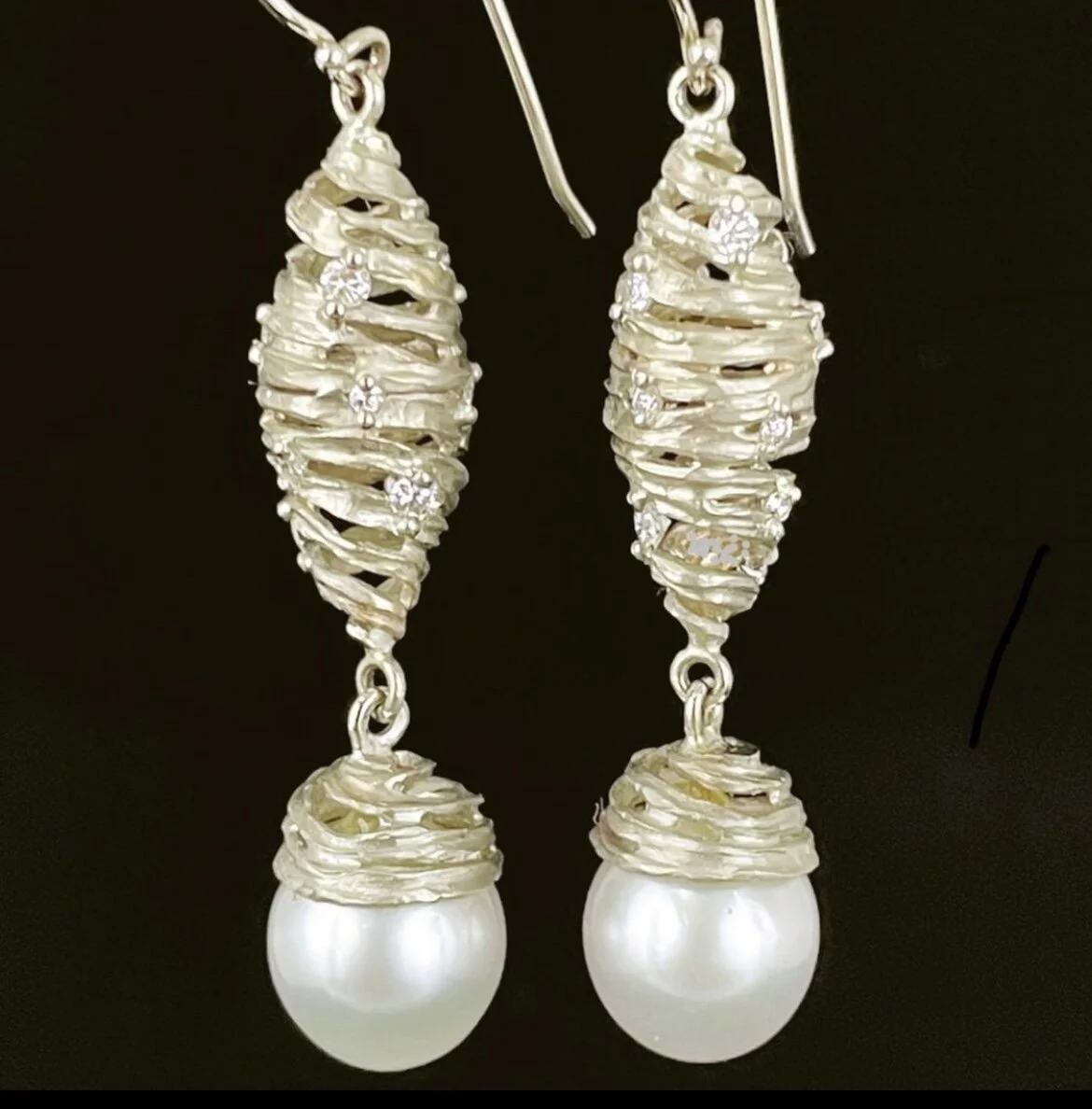 Diamonds (approximately 27 diamonds weighing over 1/2ct total weight) scattered around these cast spirals in 14kt white gold. 10mm South Seas Pearls hang from them. Each earring weighs 7.5 grams 2 1/4” x 1/2” Each earring weighs 7.4 grams